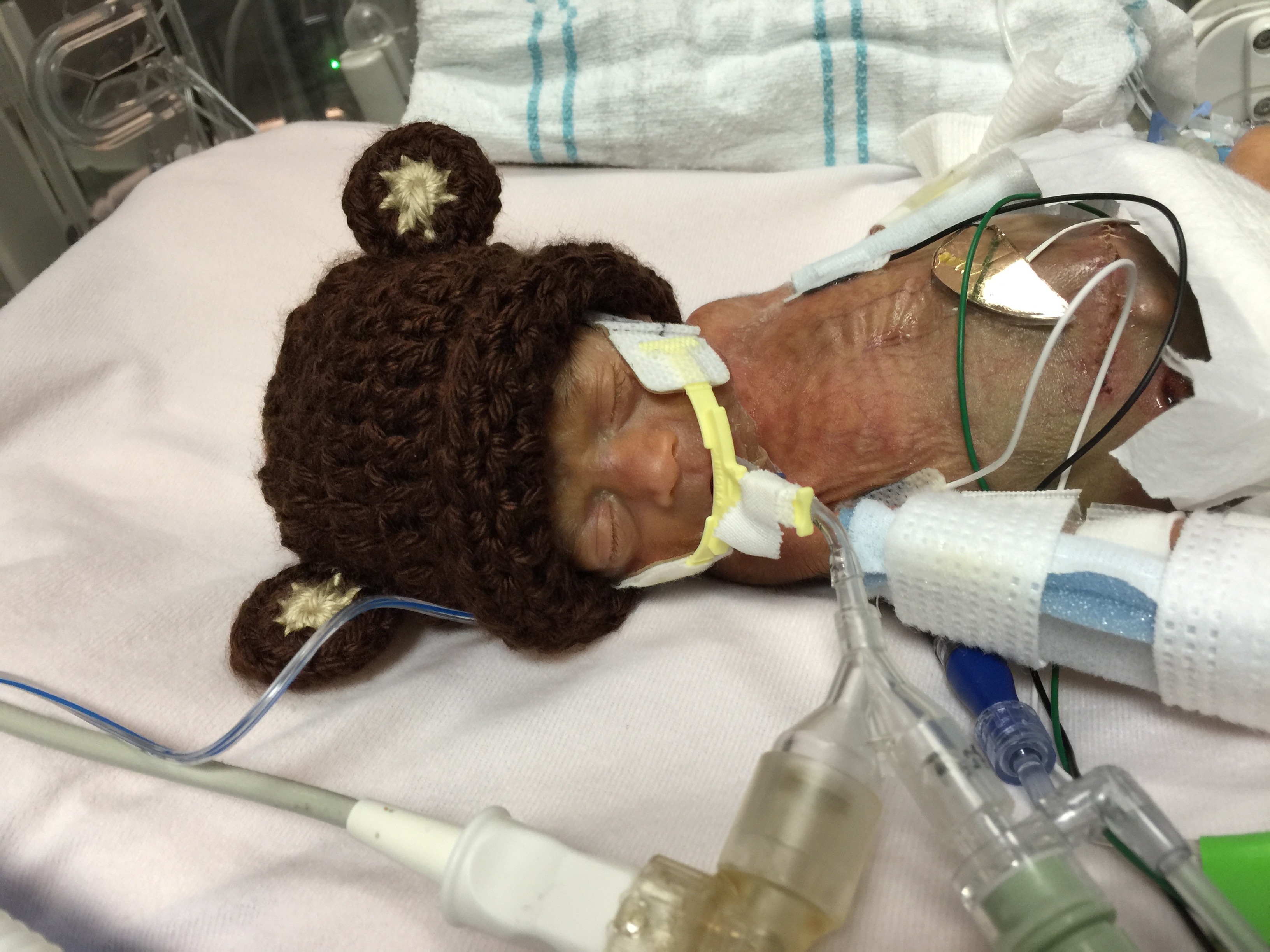 The next day hit us like another ton of bricks when Beckham’s blood cultures came back positive for infection. It was expected of course but we always tried to hold onto any ounce of hope which we were beginning to feel like didn’t exist. He was already on 2 antibiotics and a third would now be added. The doctors were debating doing a spinal tap to ensure the infection wasn’t headed for the brain but a spinal tap with a brain bleed was quite risky. They opted against it. The blood cultures showed the infection was Enterocaucus and he would now require cultures to be taken every day. This was no small feat for a now 1lb 9 oz. micro preemie. He needed to hold onto every drop of blood in his body. With so much going on he would require frequent transfusions of both blood and platelets. A new team, known as the infectious disease team, would be on his case and making rounds every day in addition to the surgical, GI, Pulmonary, neurology, and neonatal teams that were already on rounds for him. These were just the core physician teams. At this point it seemed like Beckham didn’t have anymore space on his body for all the lines running to and from him. He was completely surrounded with oxygen, feeding tube, med line, transfusion lines, heart monitor, pulsox and soon would have an ostomy bag added to the site of the resected bowel now protruding from his stomach. All of this on a baby that weighed as much as an apple, inside a heated incubator as at this gestation his body was unable to regulate it’s own temperature. We waited anxiously every minute for new results. For something to come back negative, for that ounce of hope we kept believing would be there for us. Anything would be a victory at this point whether it was weight gained or oxygen sustained. There had to be a light at the end of this never ending tunnel of hell. A few days later that light we had been waiting for would finally be given to us.